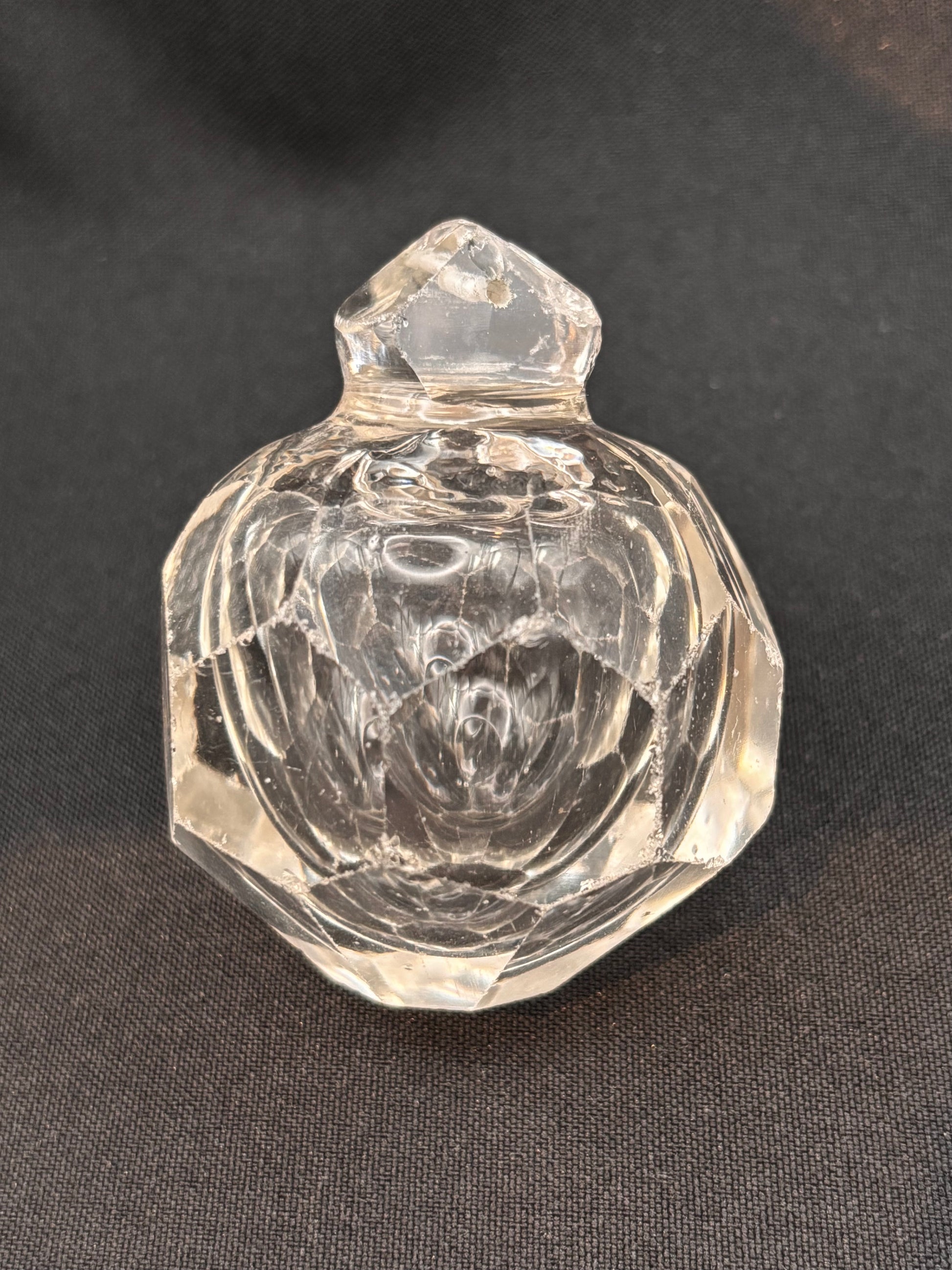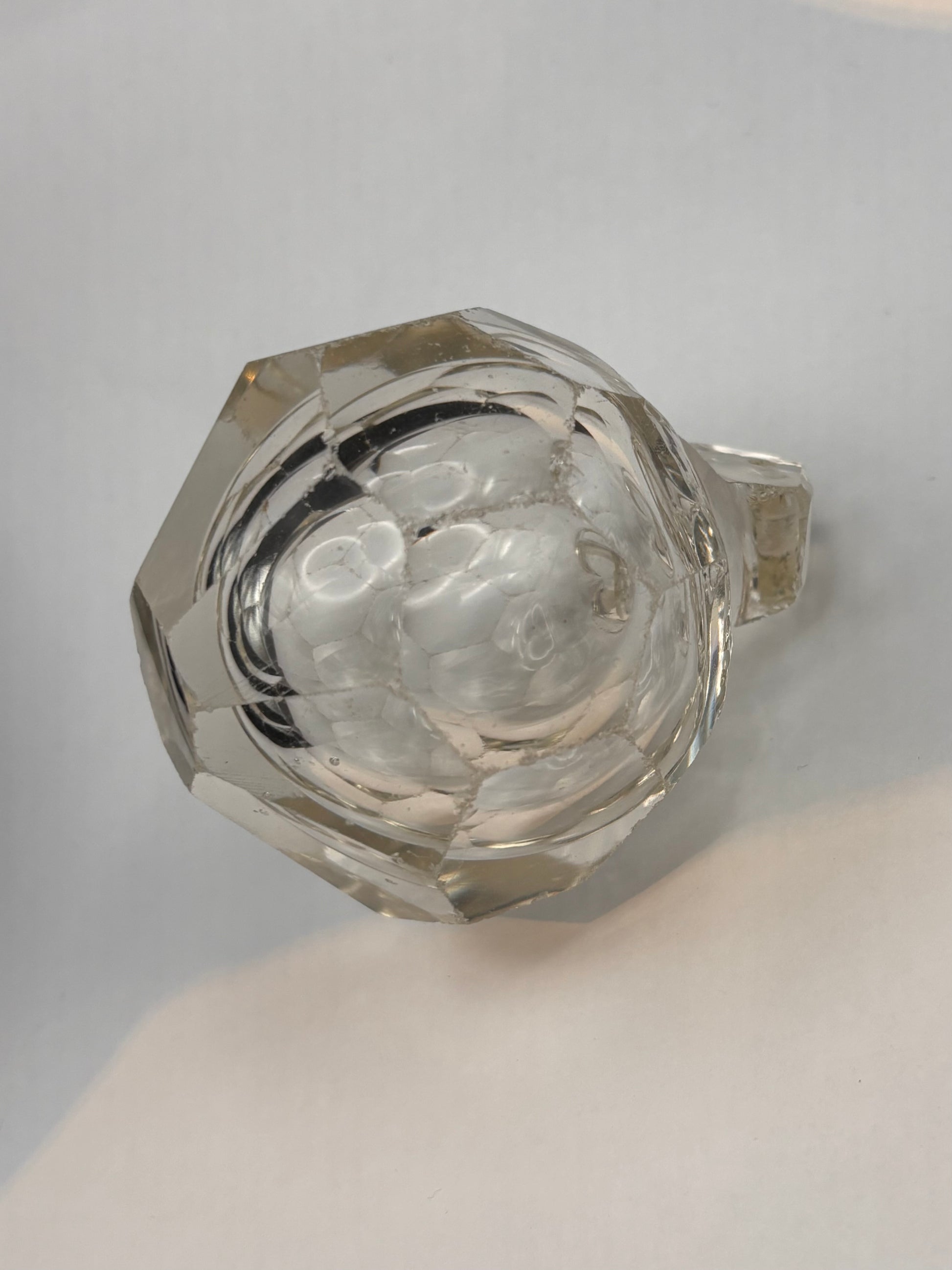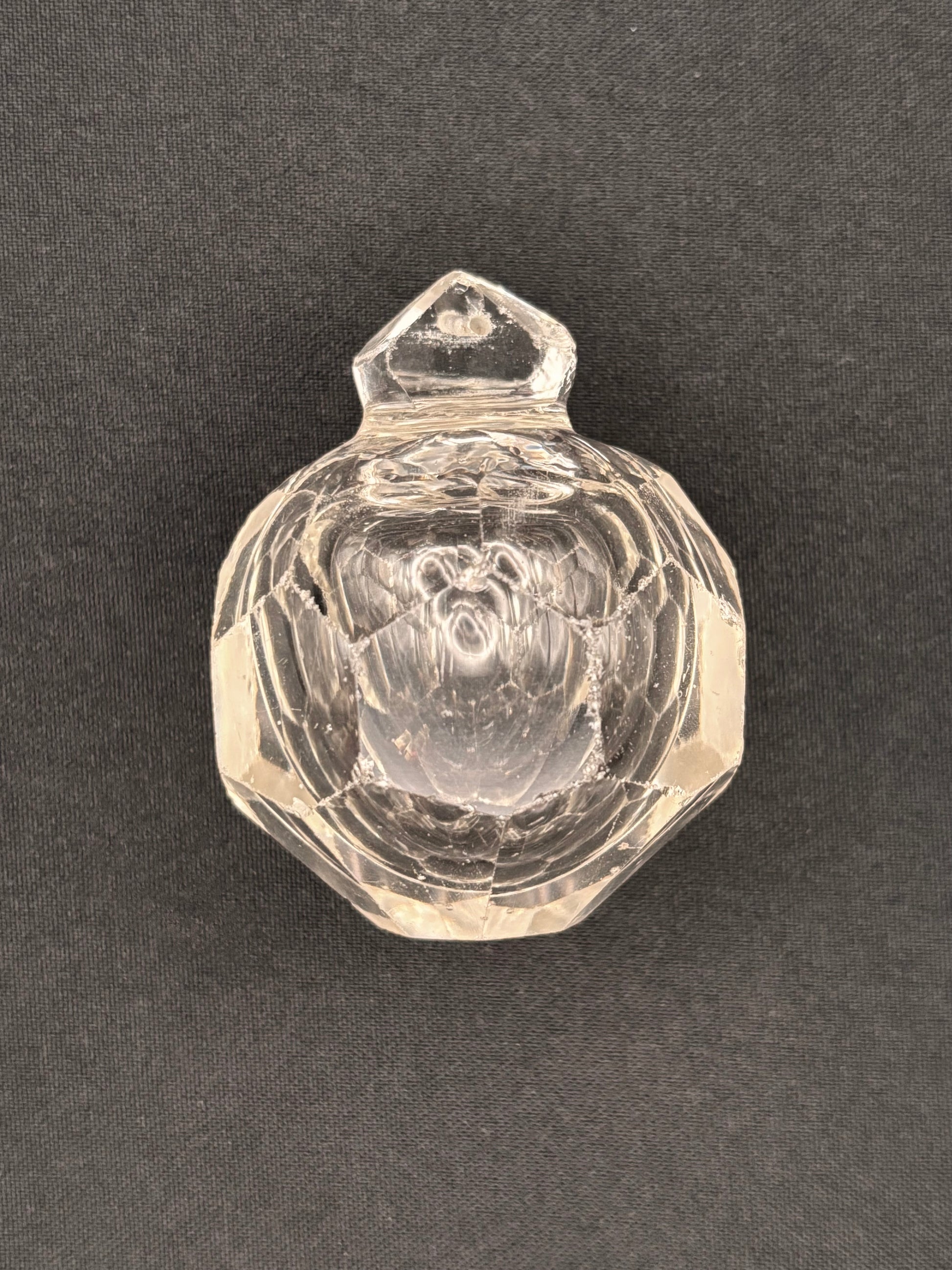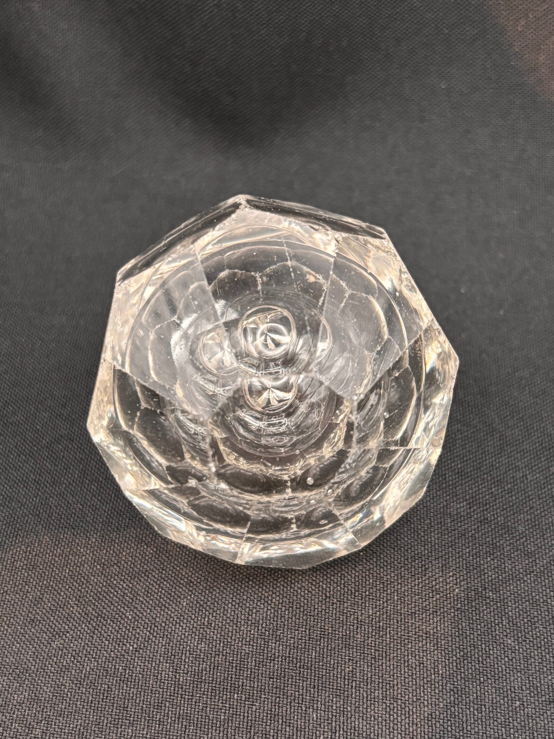 Finial with 25 facets in honeycomb shape. Inside an air bubble. Transparent glass.