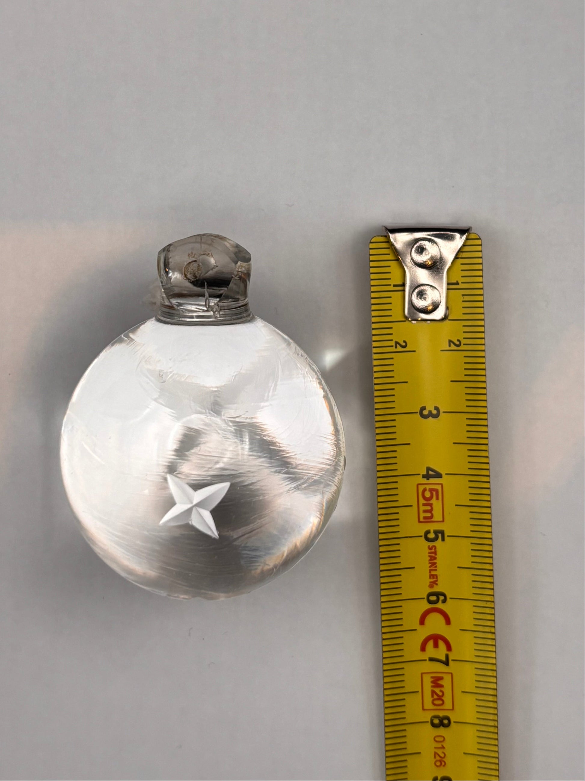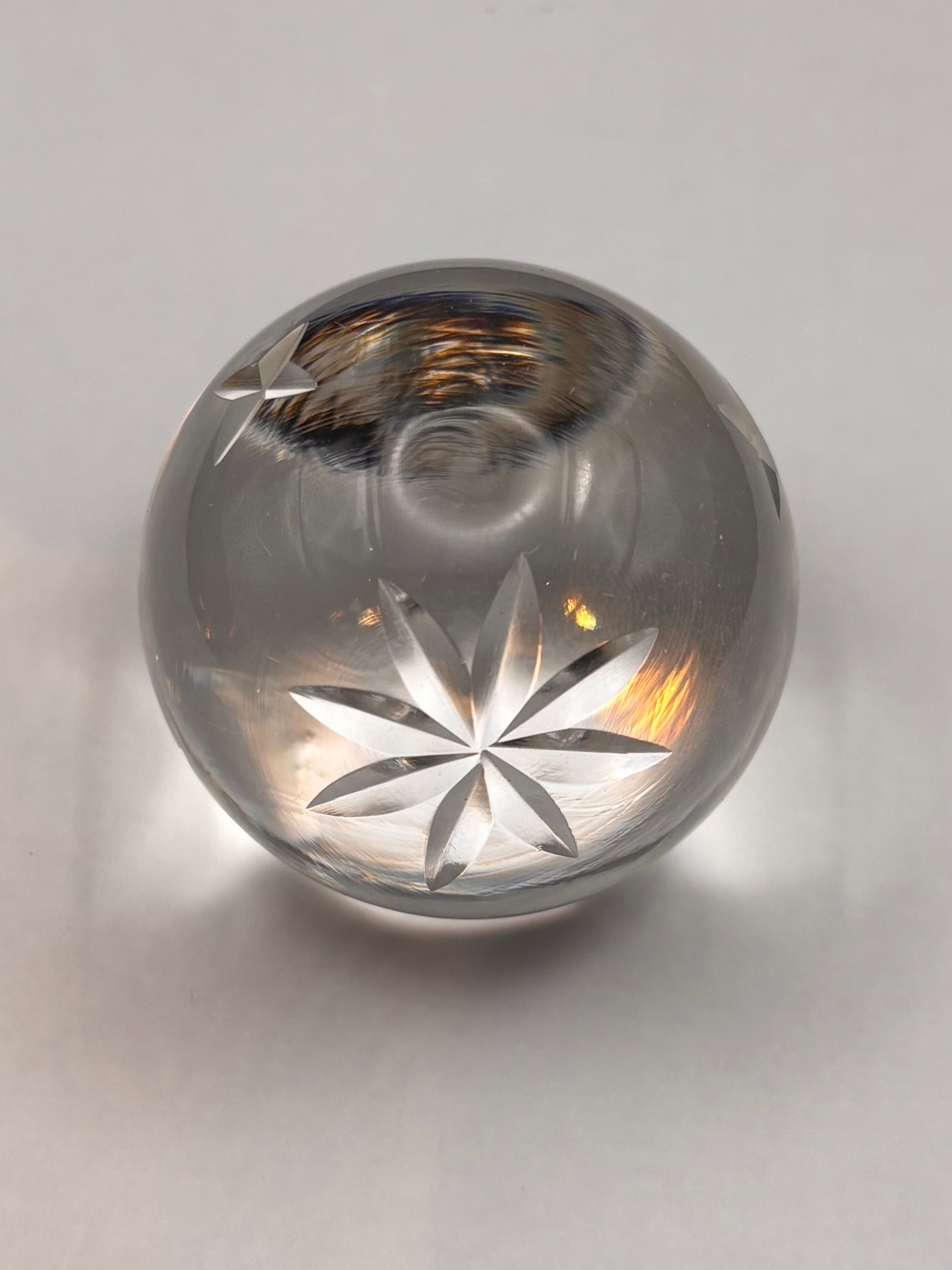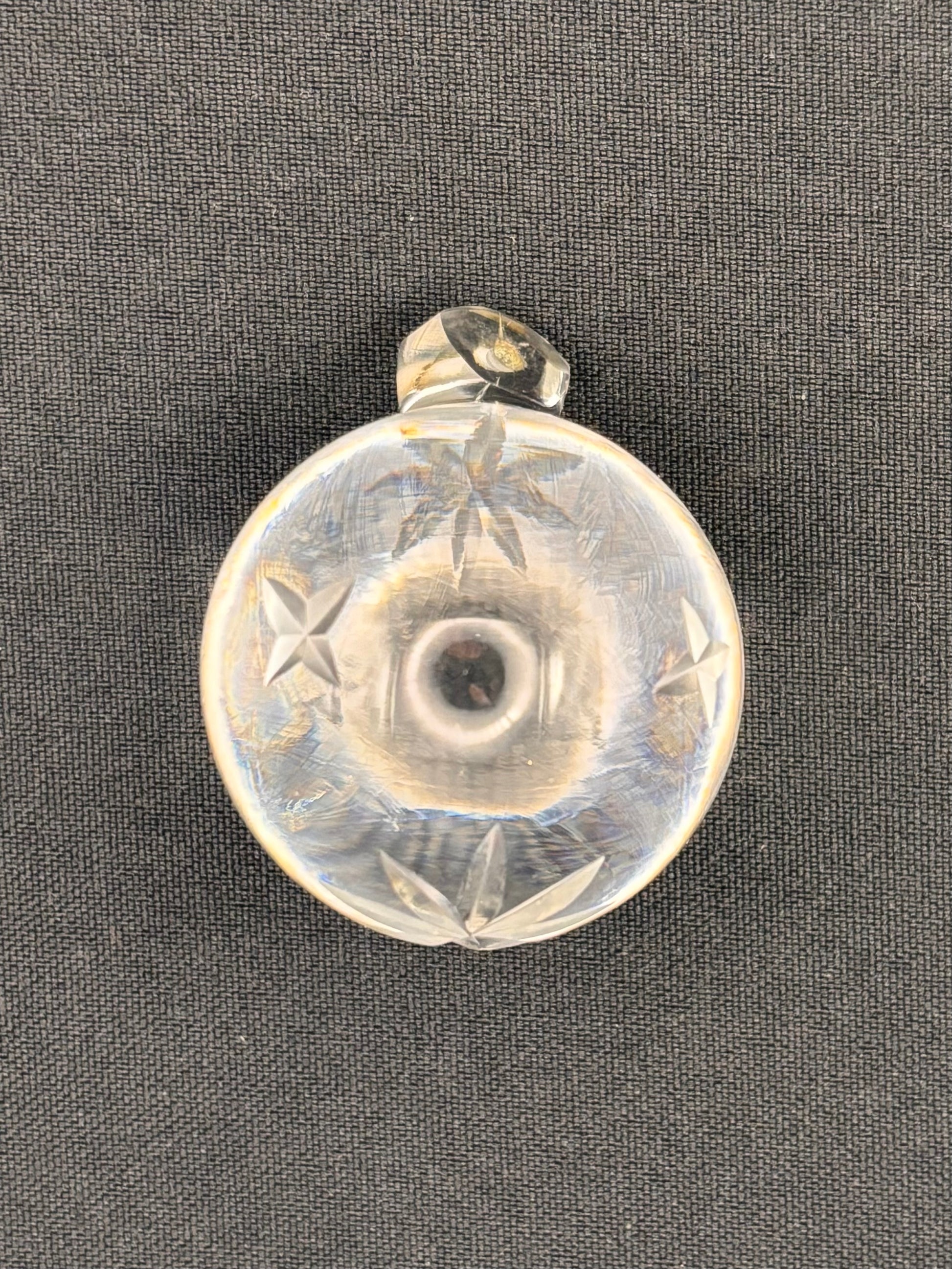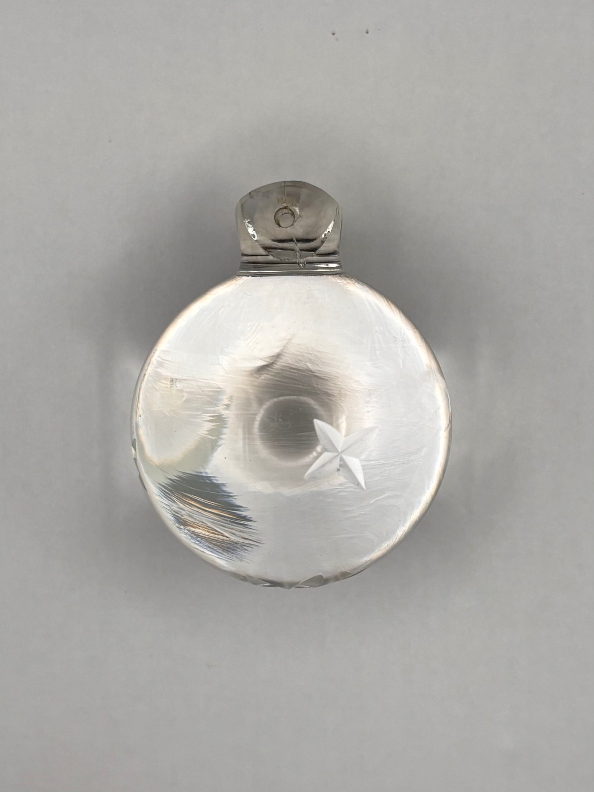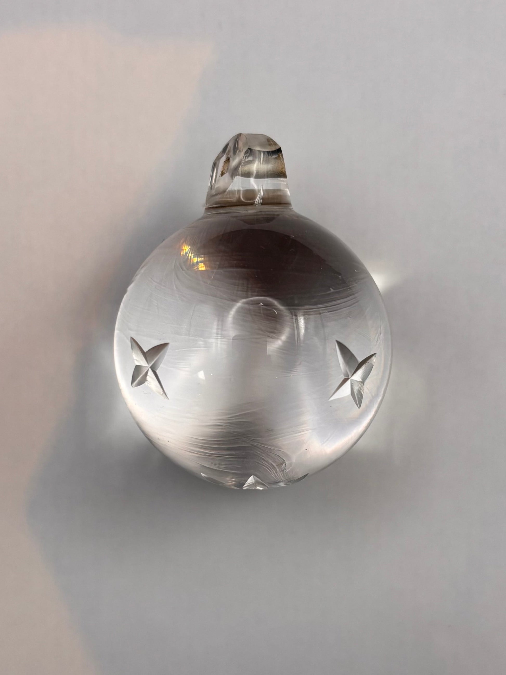 Round finial decorated with four small stars round the centre and a large flower on the bottom. Stars are cut in the glass.