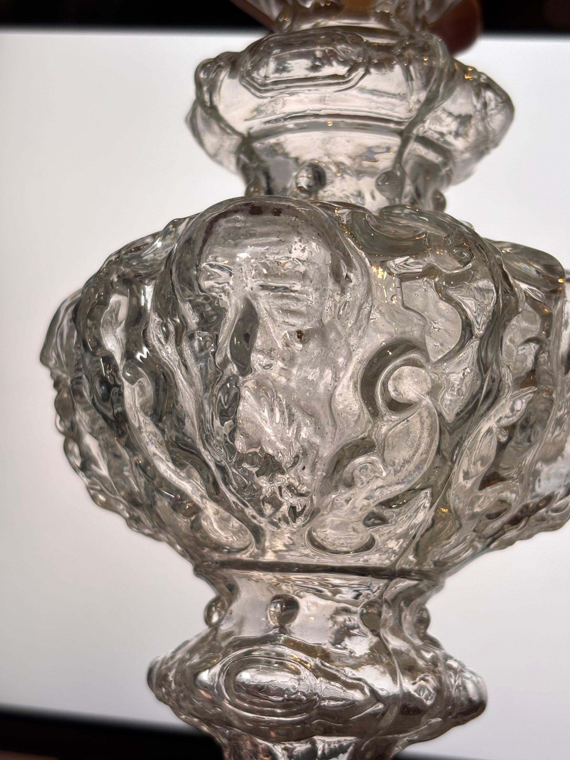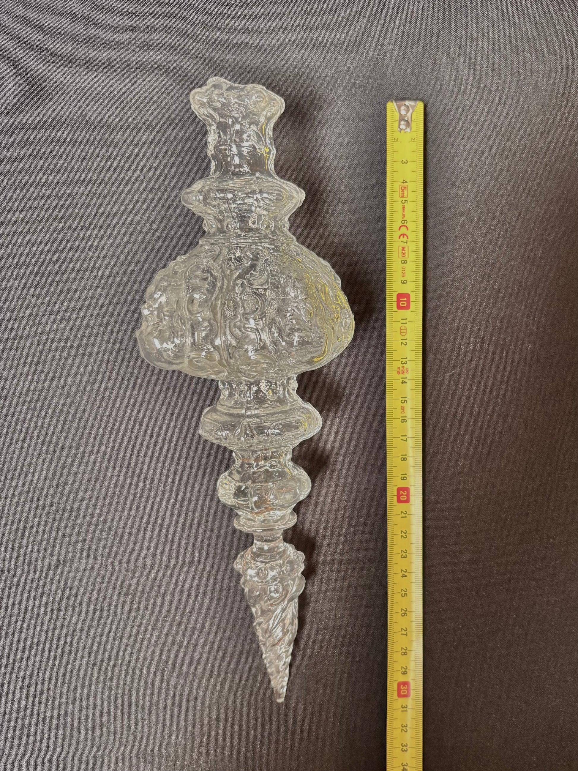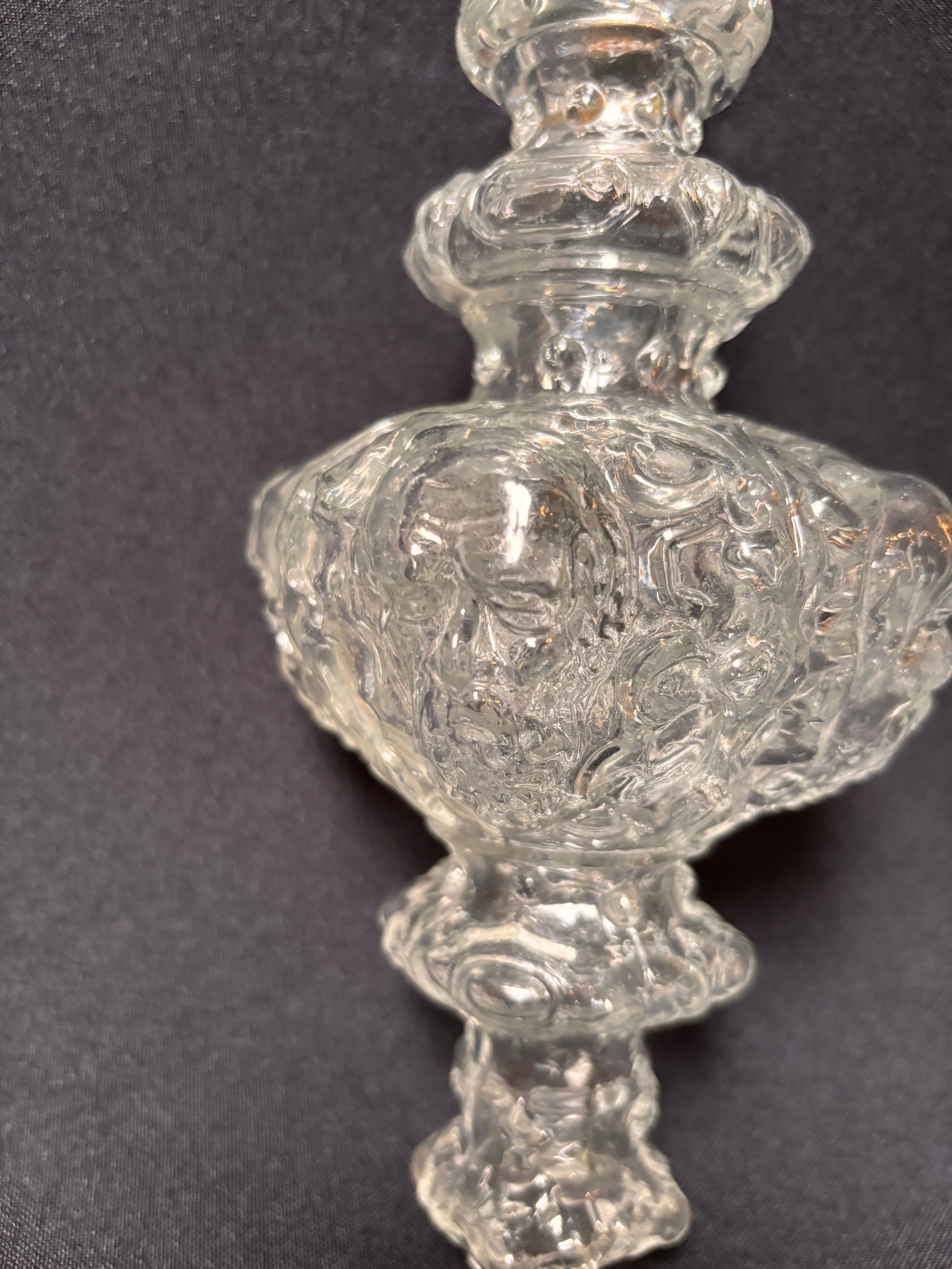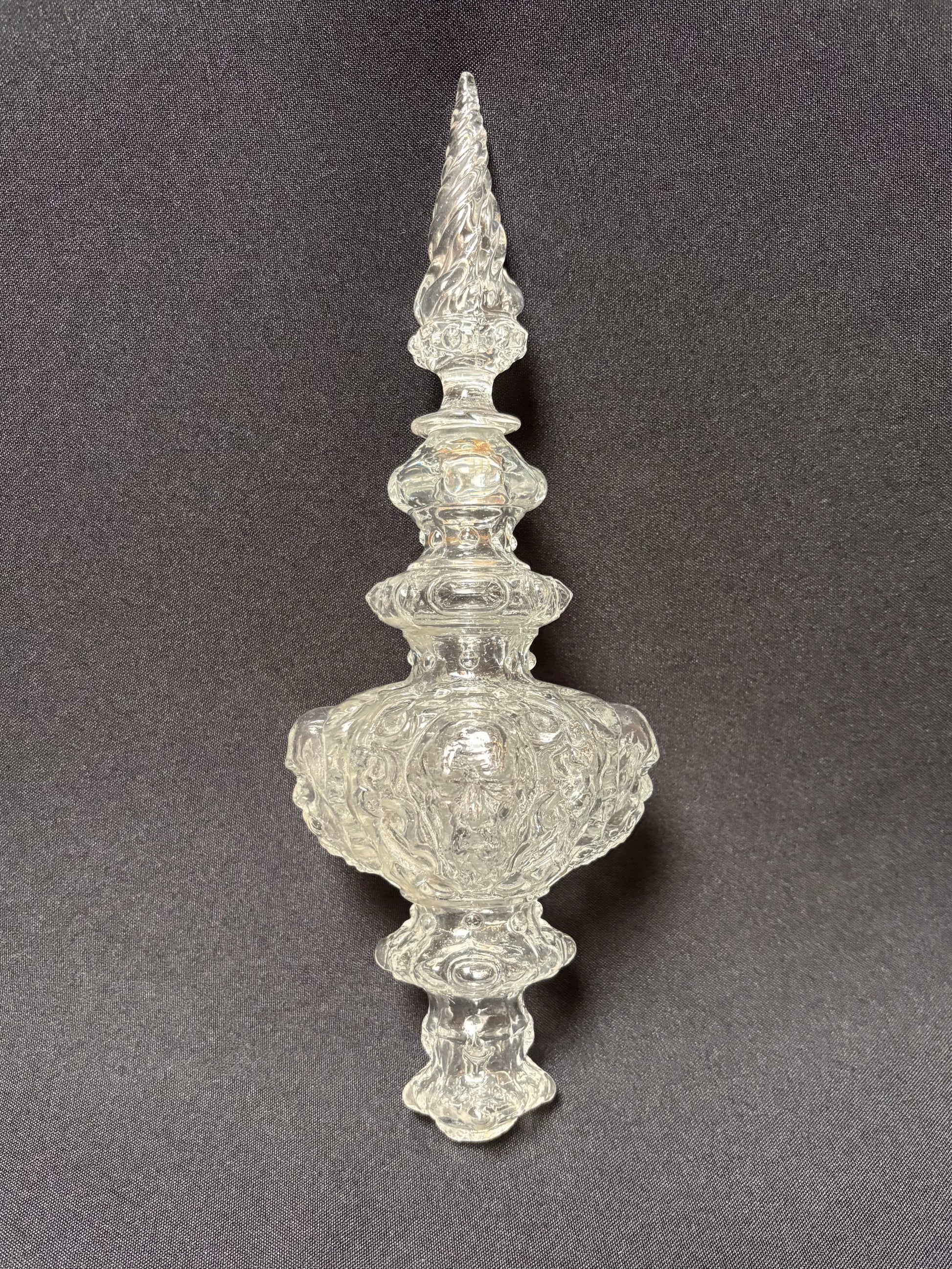 Pinnacle with four bearded heads, a holy figure. This pieces has an exquisite shape, from bottom to top; the largest part with four faces, slighty gazing downwards, above that a ring with fine droplet-shape facets followed by two more faceted rings. The piece ends in a large twisting flame.
