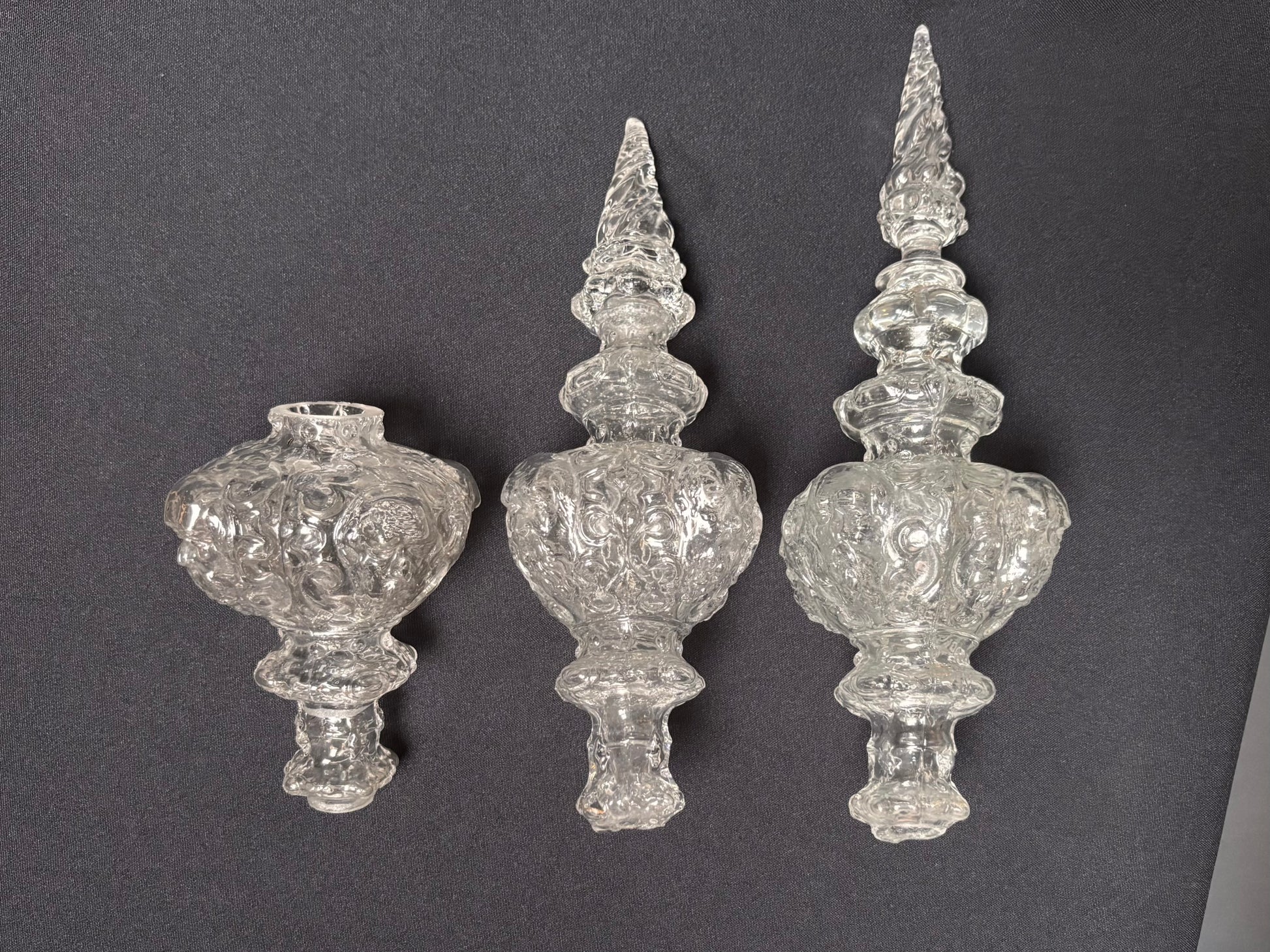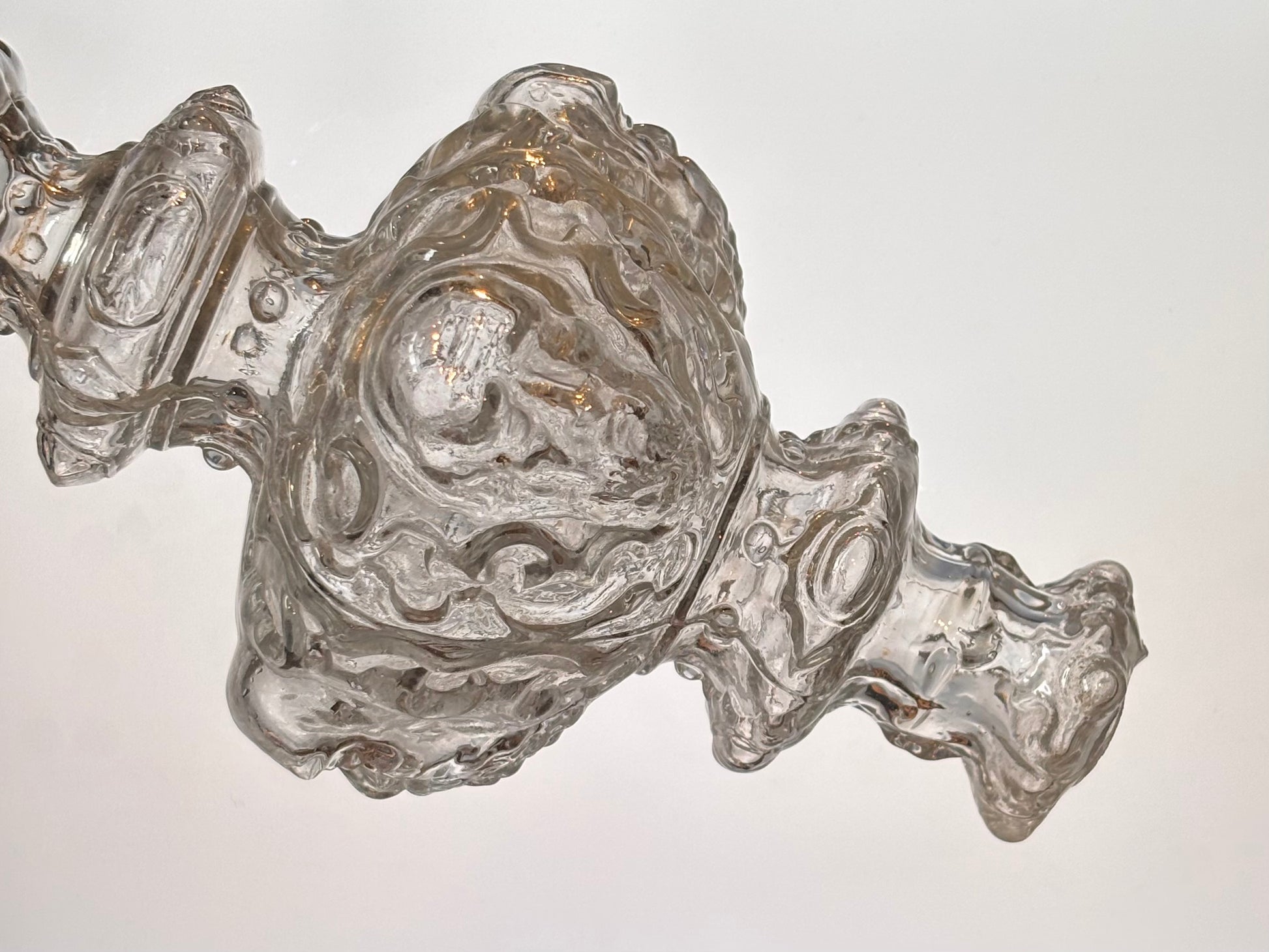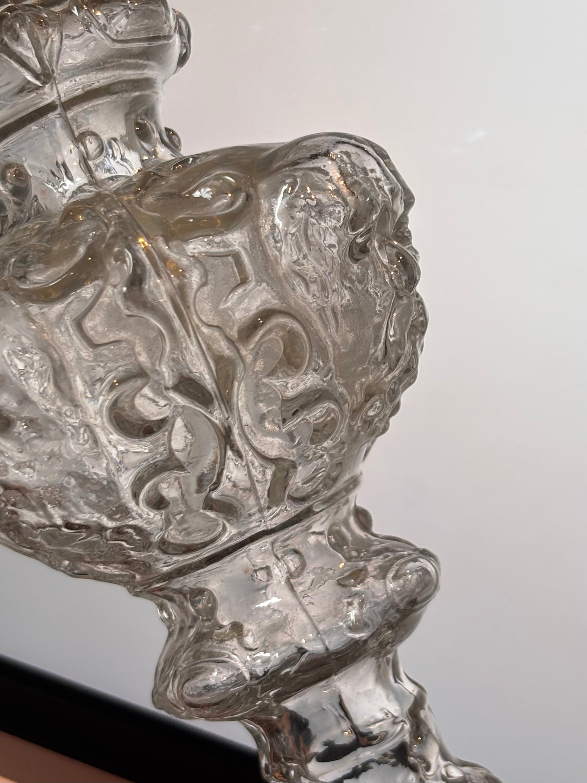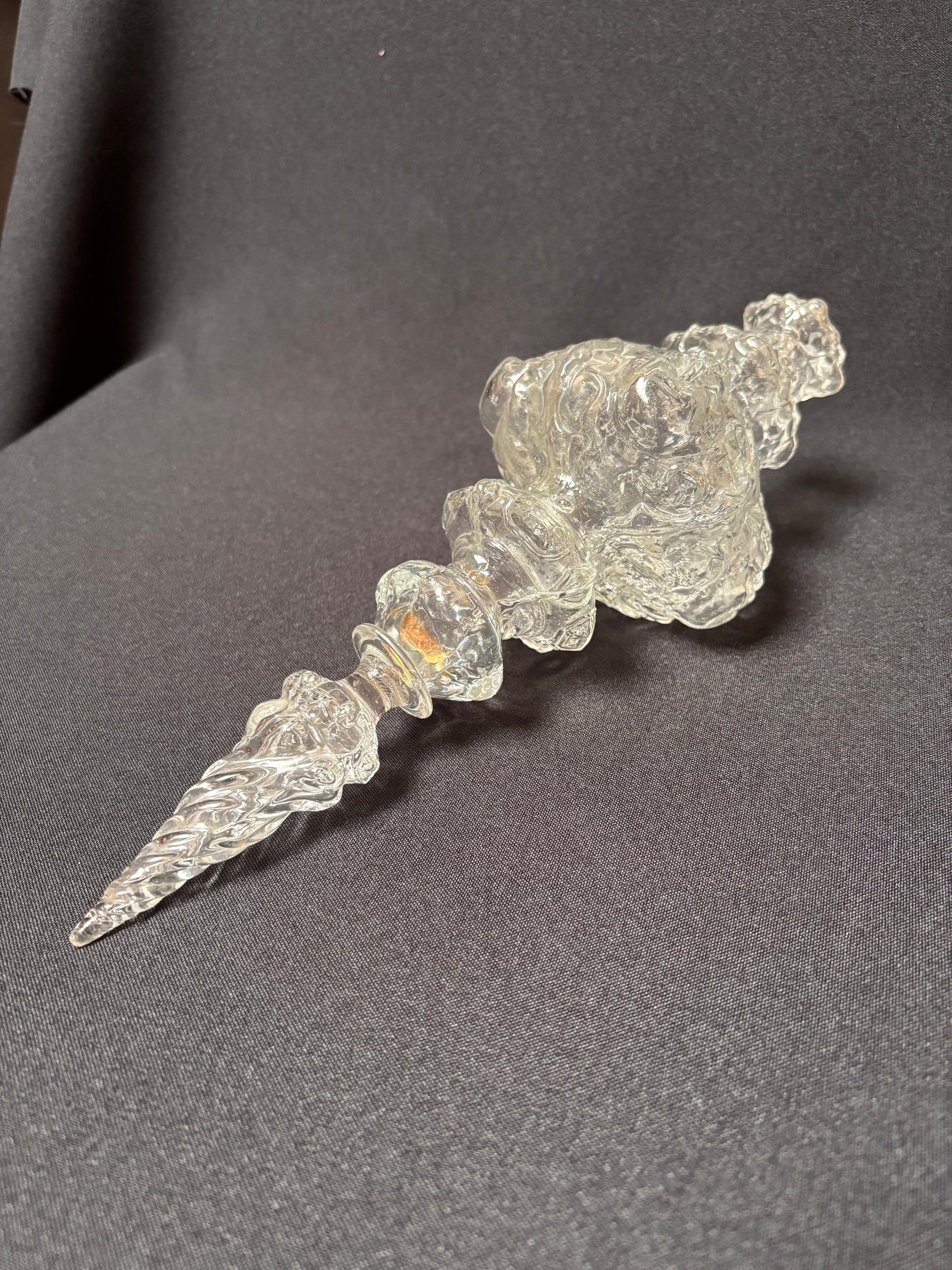 Pinnacle with four bearded heads, a holy figure. This pieces has an exquisite shape, from bottom to top; the largest part with four faces, slighty gazing downwards, above that a ring with fine droplet-shape facets followed by two more faceted rings. The piece ends in a large twisting flame.