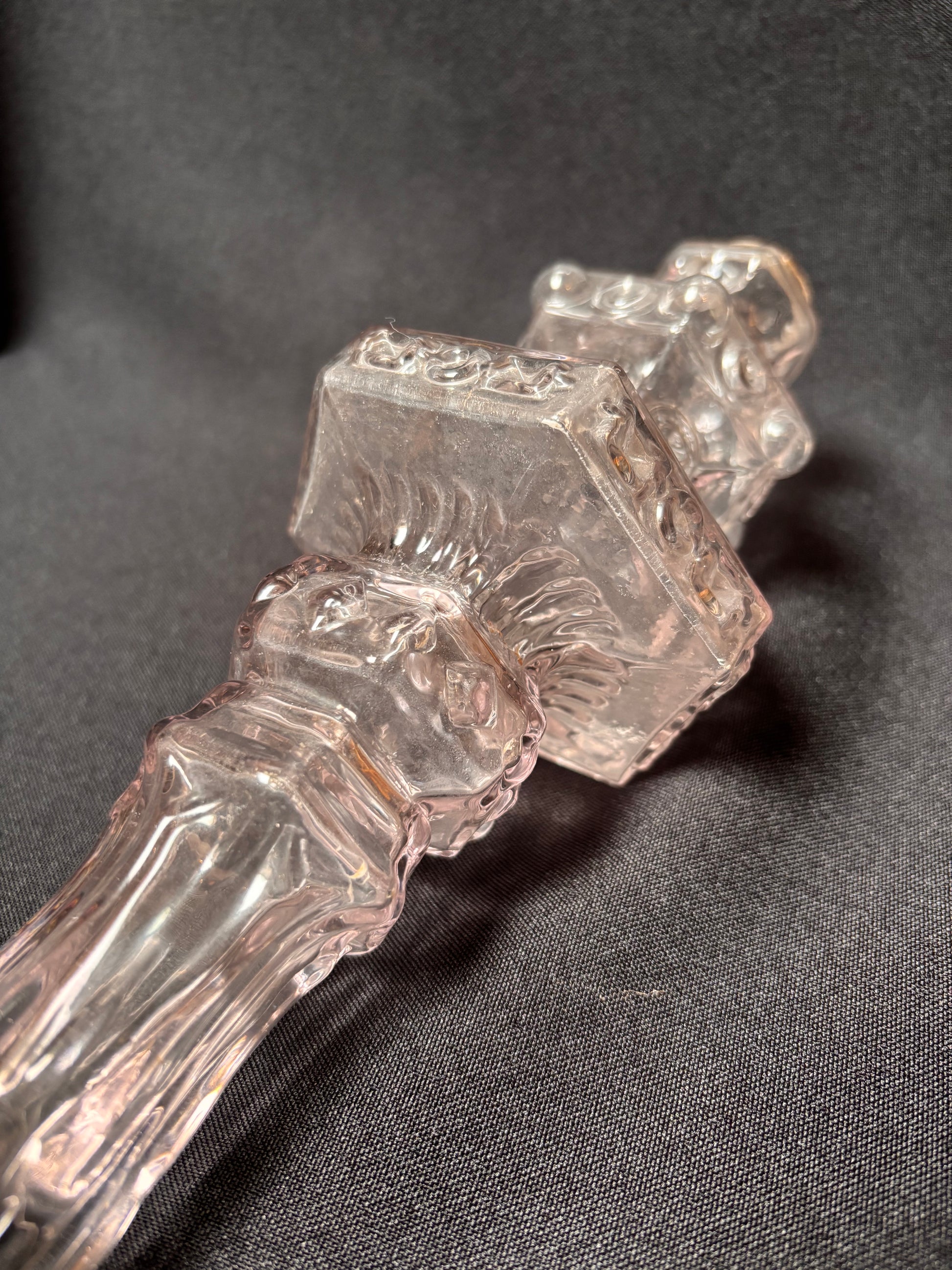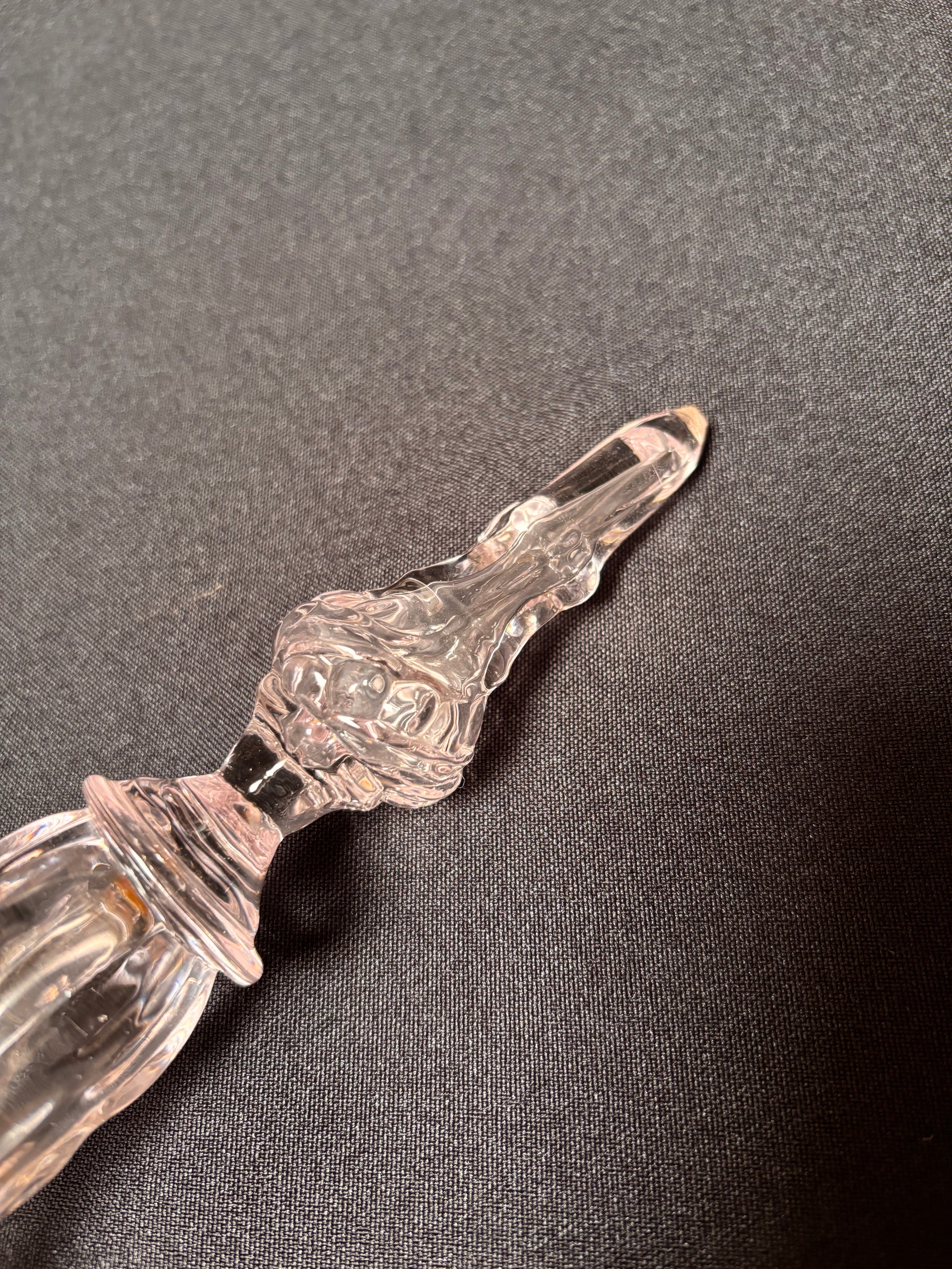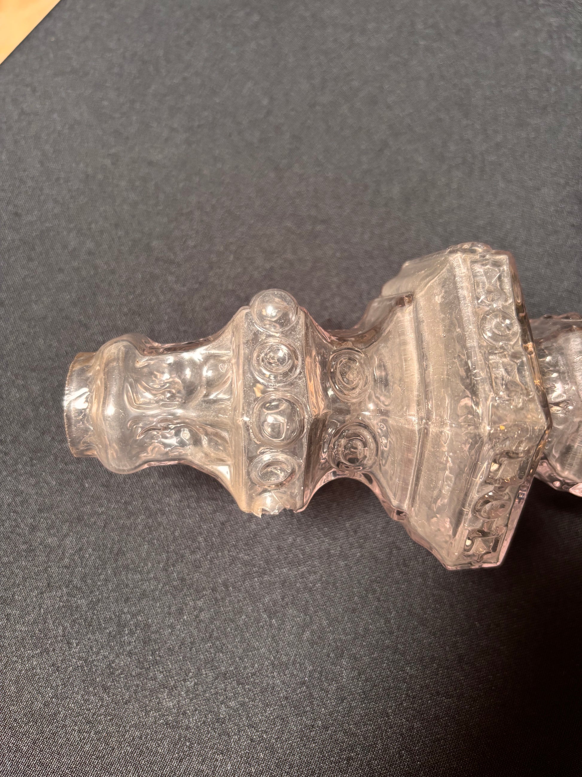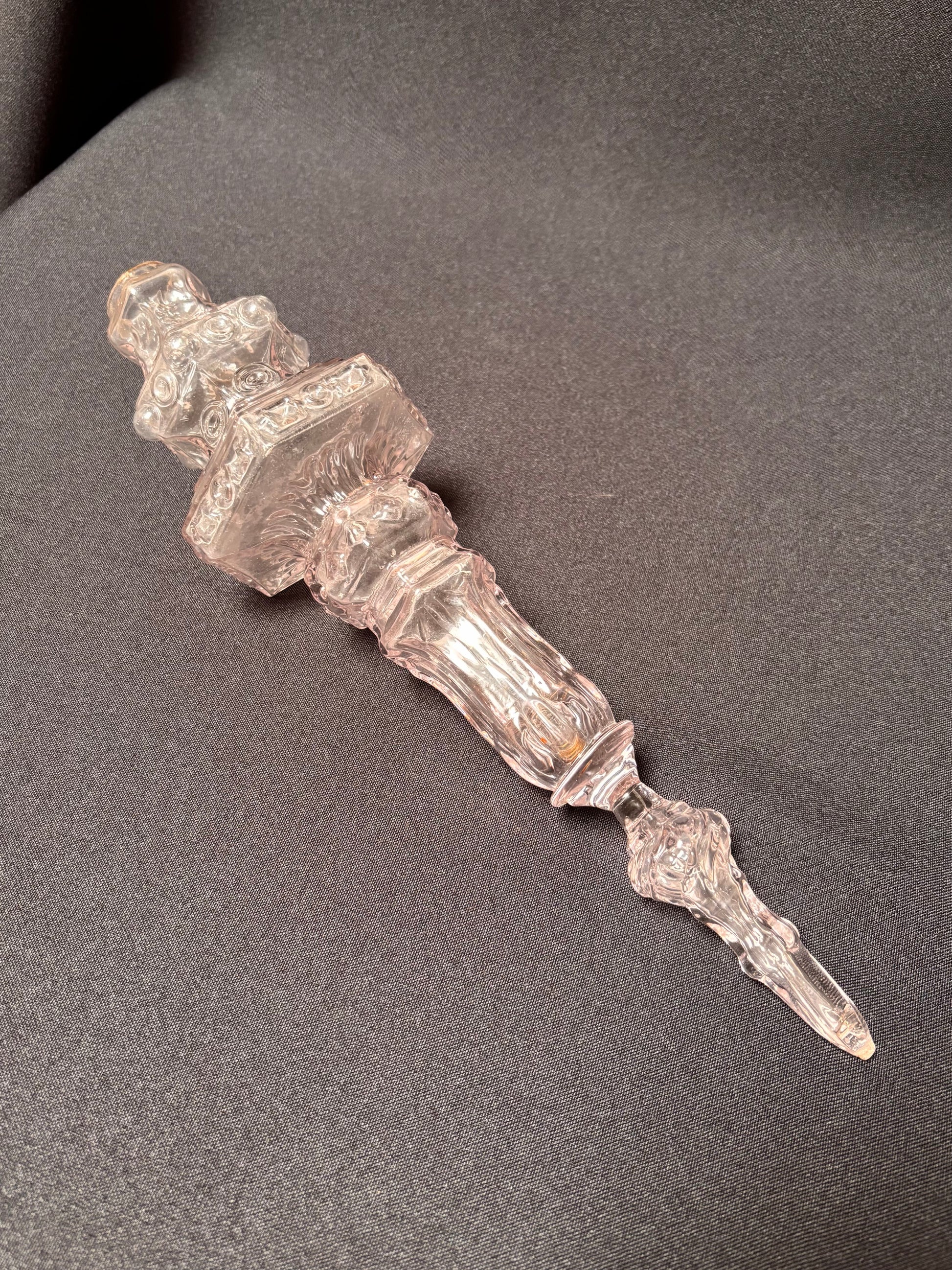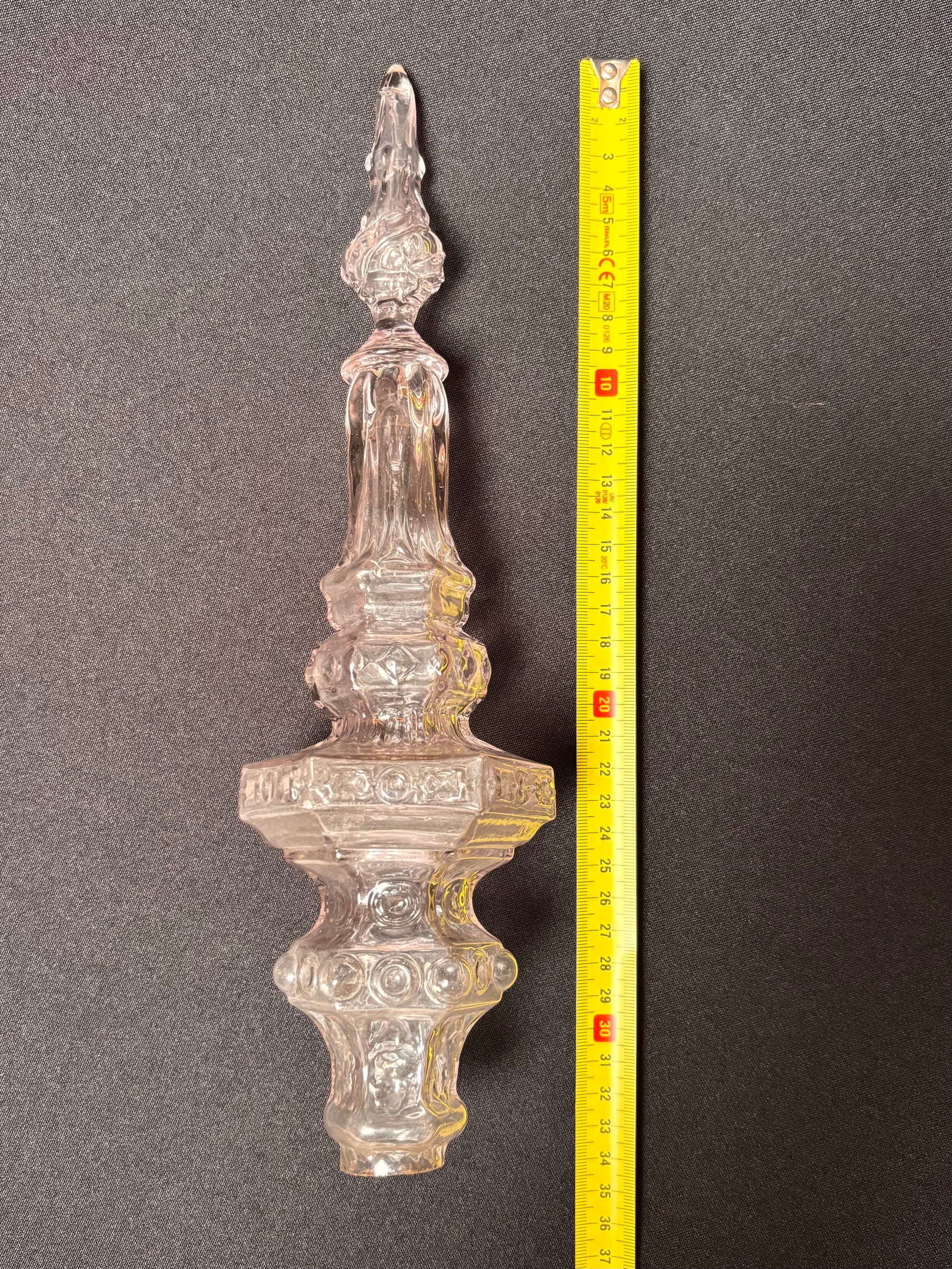 Pinnacle decorated with facets in the shape of squares and circles and a flame at the top. The glass of these pieces is slightly purple (natural degradation effect of some types of glass).