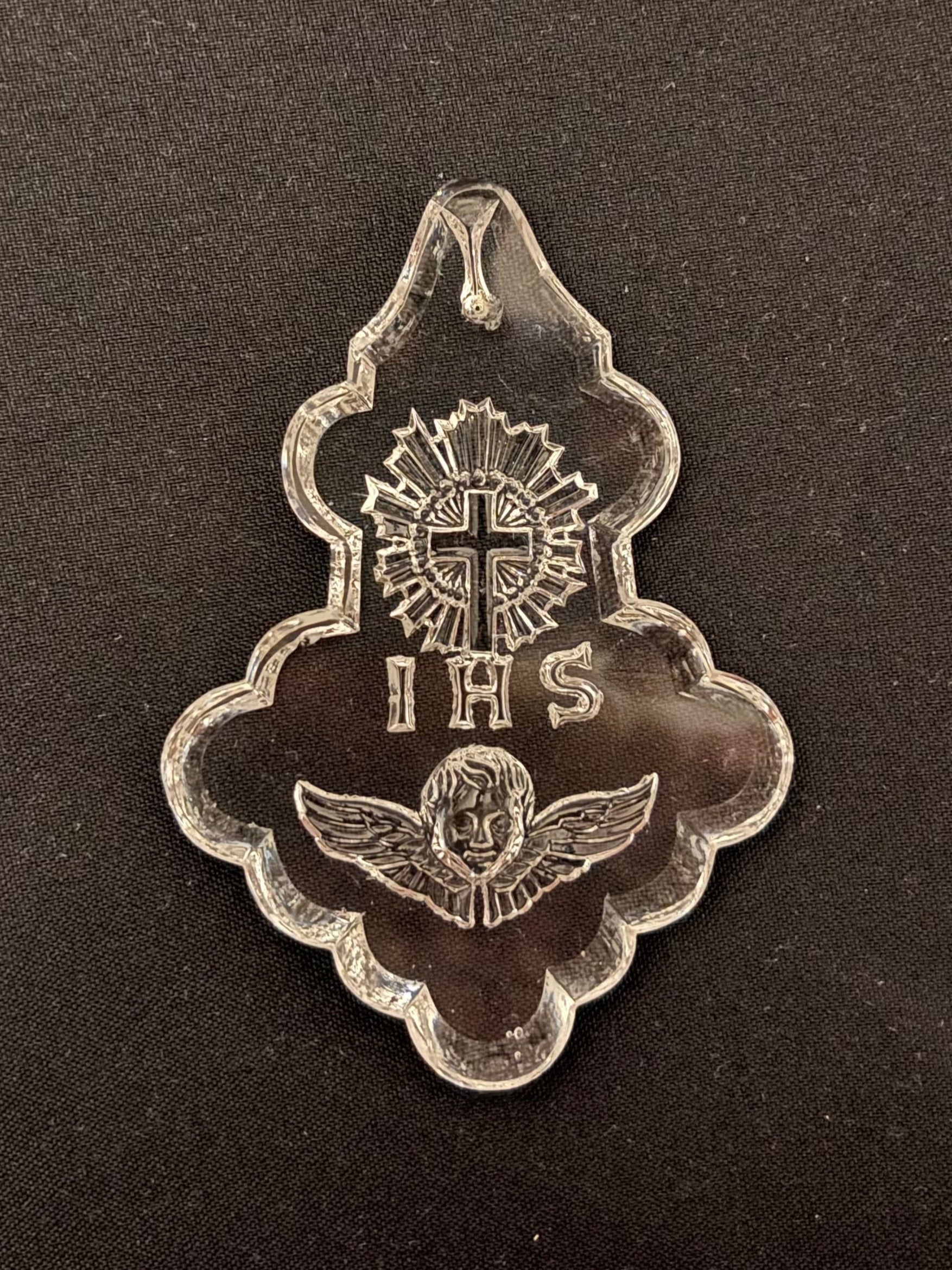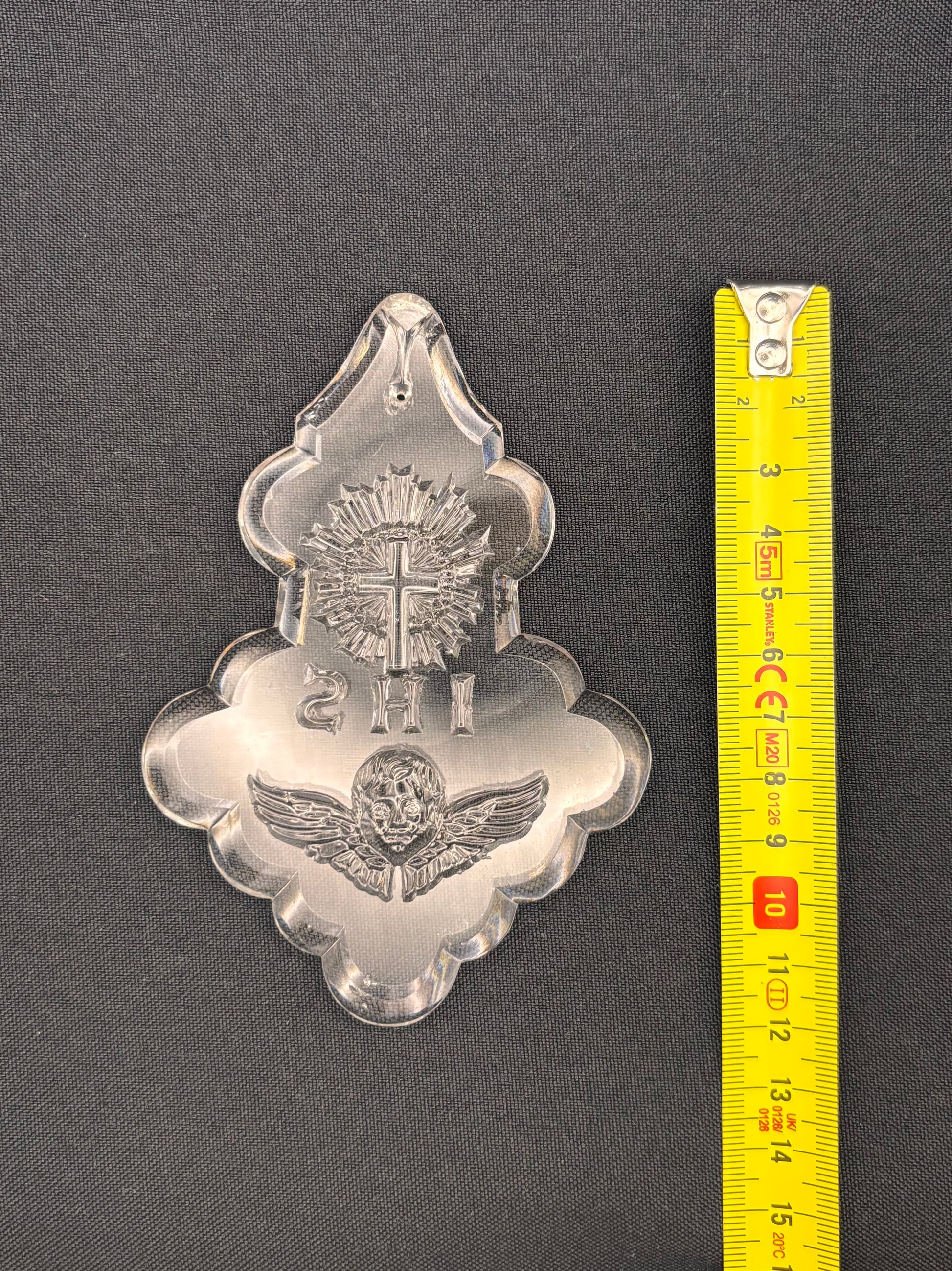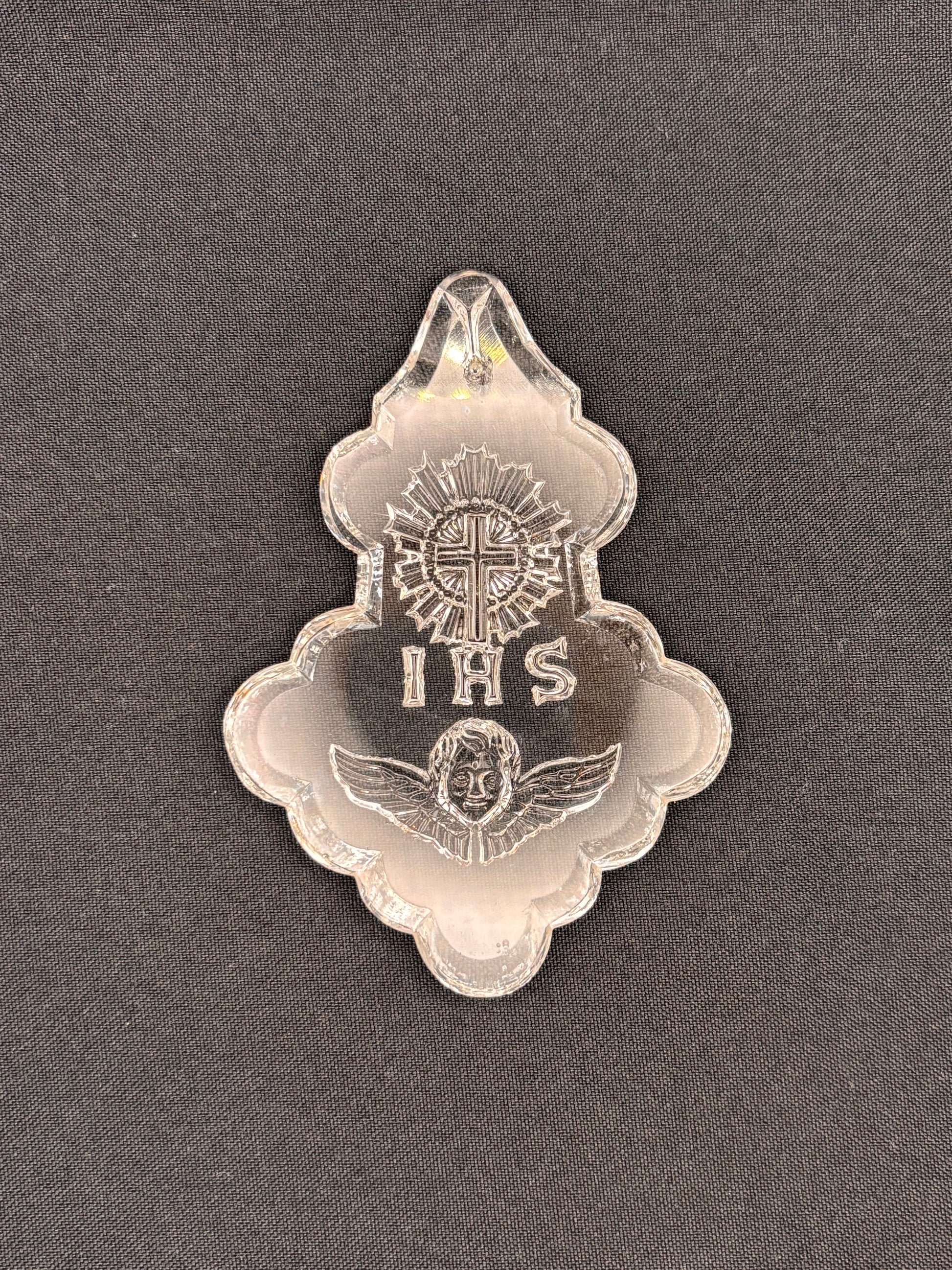 Plaquette with putto or winged angle, letters IHS and a cross with rays. Outline with rounded facets.