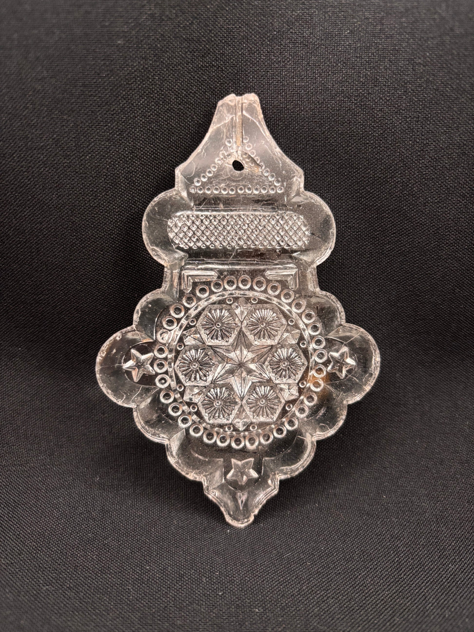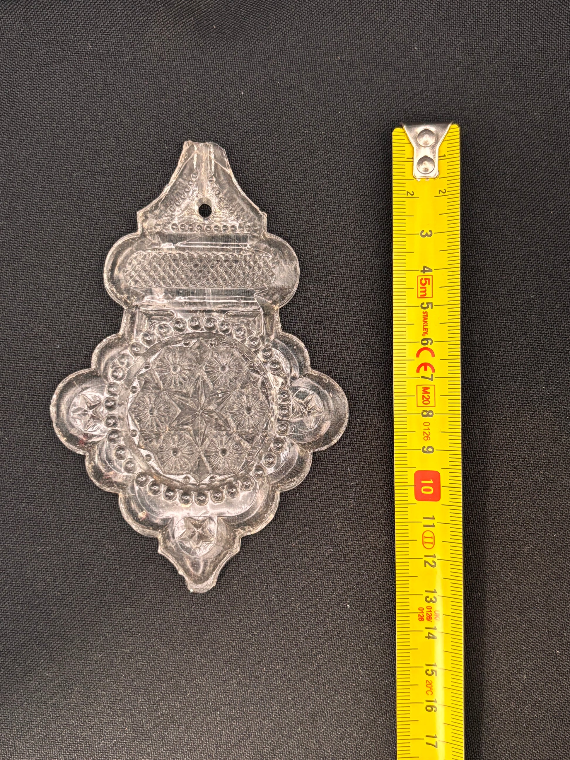 This plaquette has a large circle in the centre with a star and six hexagonal shapes around it. Beads elaborate the rounded shape and three stars accompany it. The top of the piece shows a raster-like decoration. Outline of this plaquette is shaped with rounded facets.