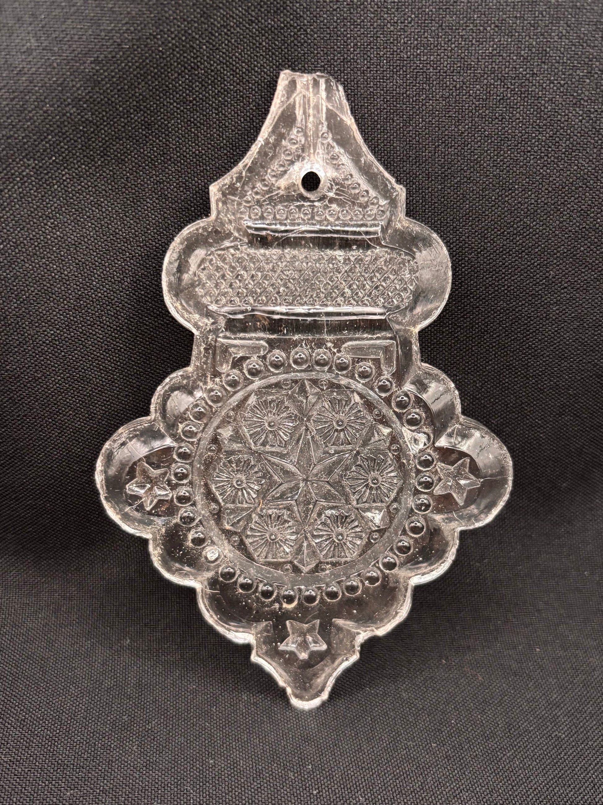 Technique: pressed glass, or verre moulé. However, the pieces are not cut afterward so traces of the mould are still visible. This highlights the elaborate process of making these pieces from hot glass paste to fine product.
