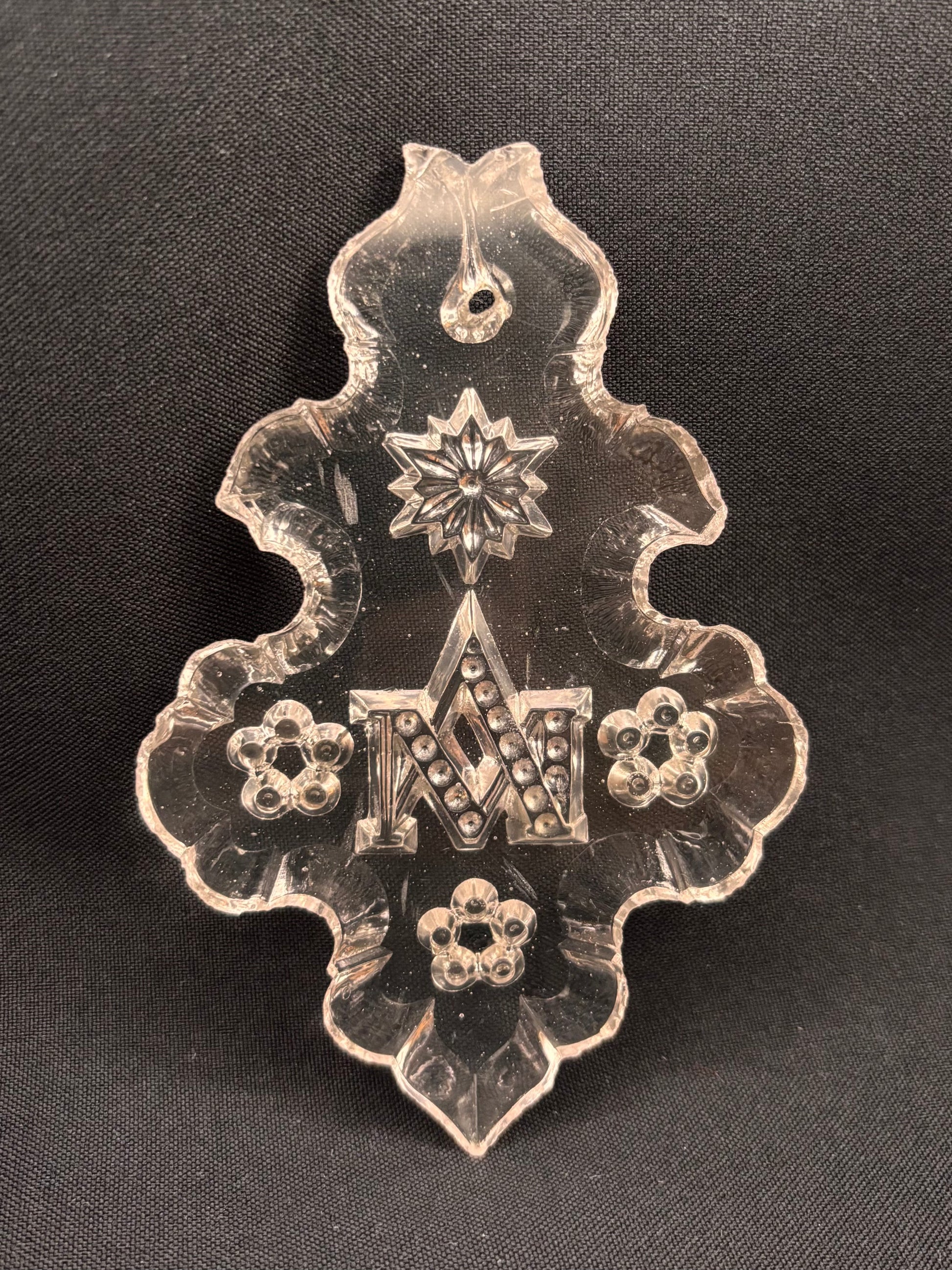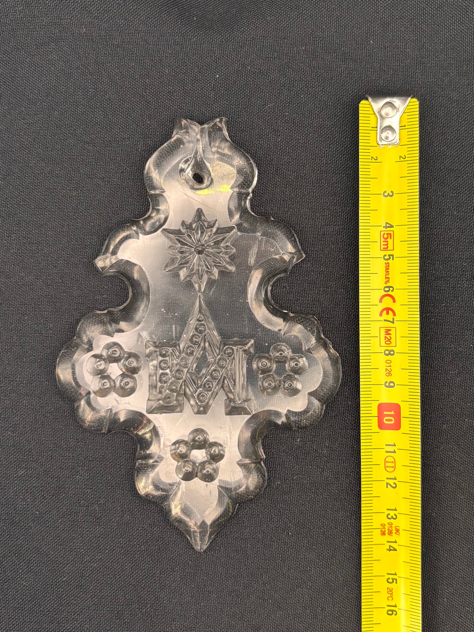 Plaquette decorated with monogram of intertwined M and A (symbol referring to Mary), three flowers and a star. Outline with facets and undulating shapes.