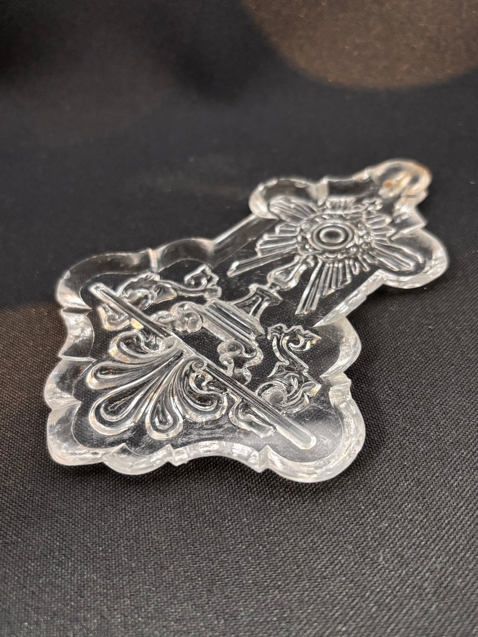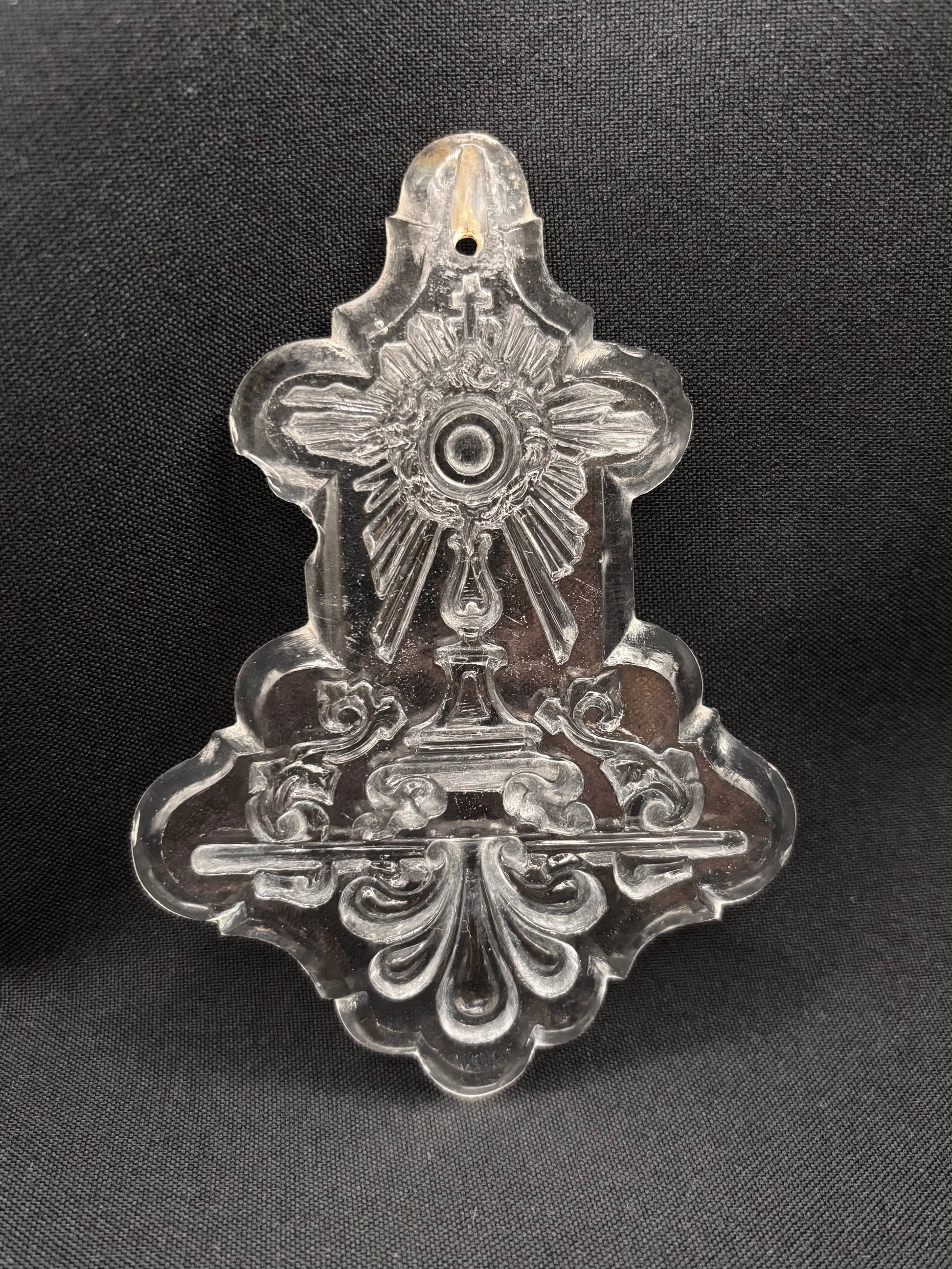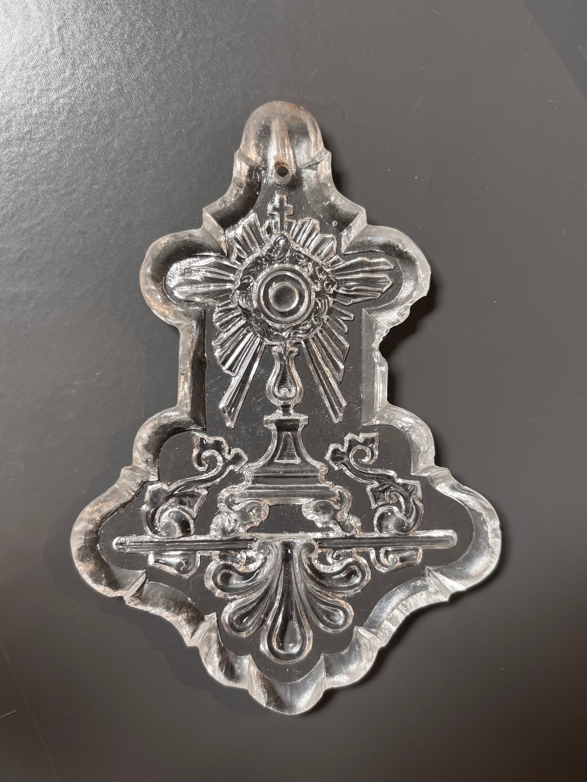Plendidly decorated plaquette bearing a monstrance on a candelabre, with beams at the top and at the lower bottom some scrolls and a palmet. The edges of the piece are cut in rounded facets. With light falling though the piece, the design is clearly highlighted. Look carefully, fine details are added to even create texture on the foliage and the candelabre.