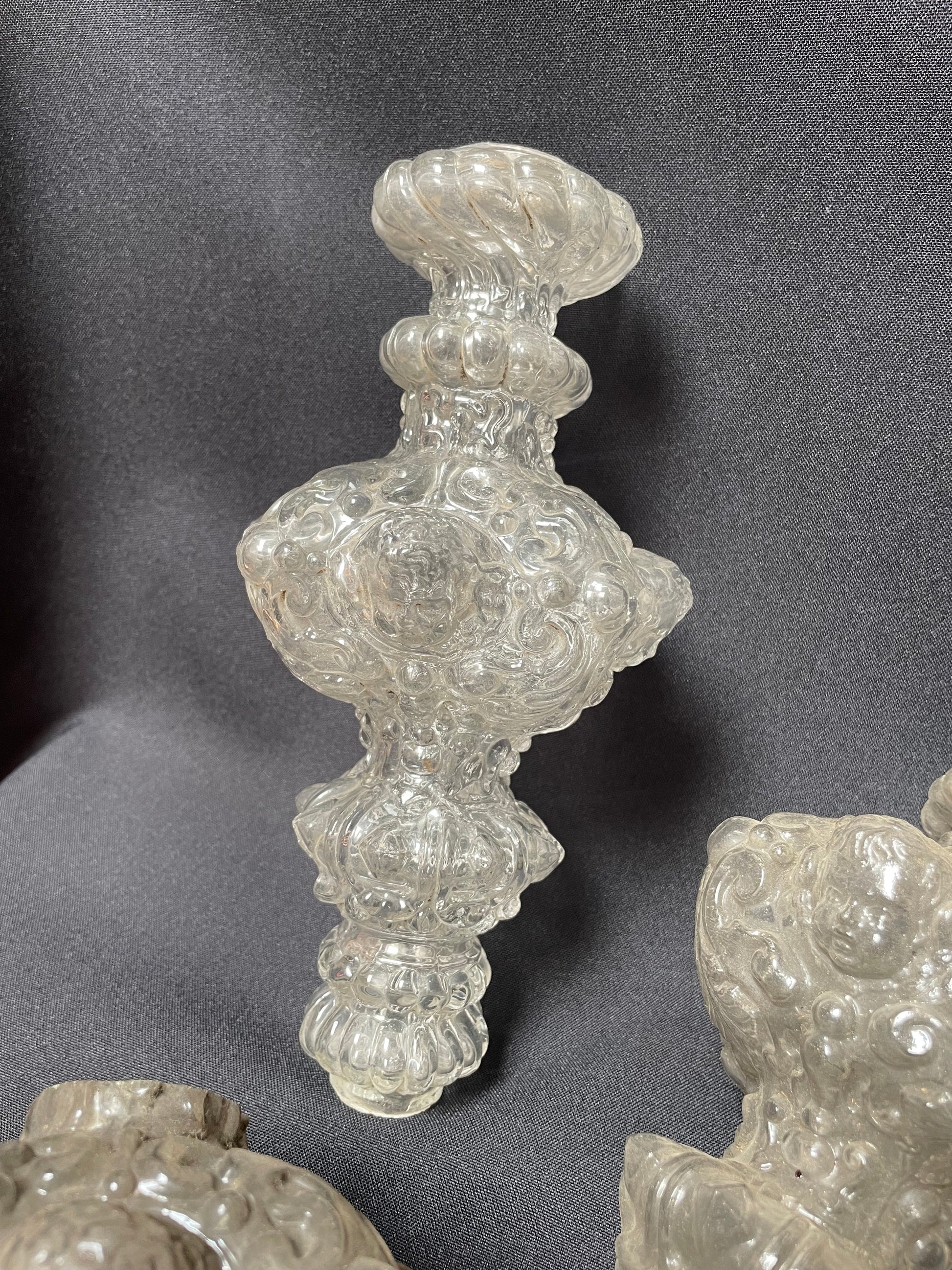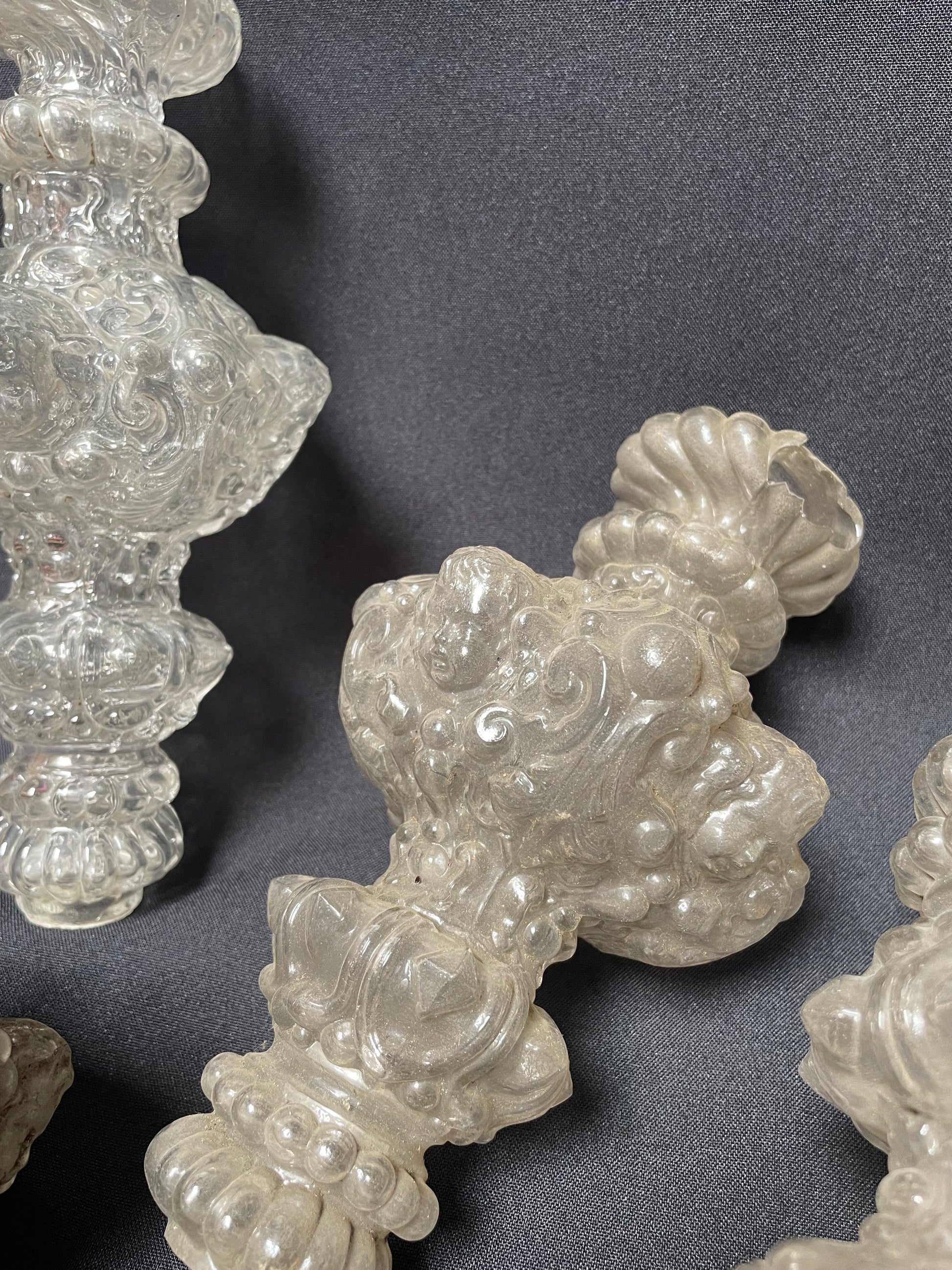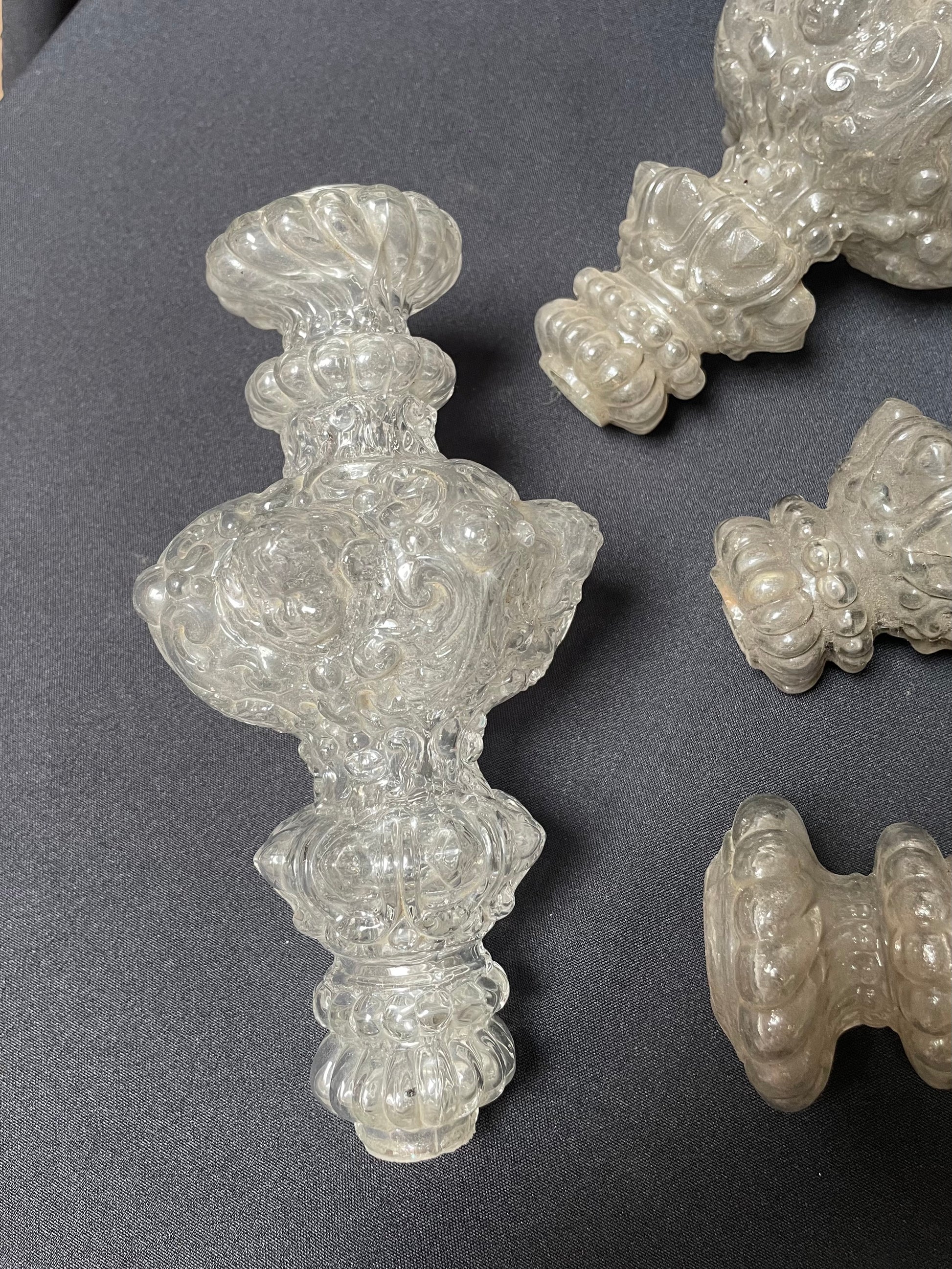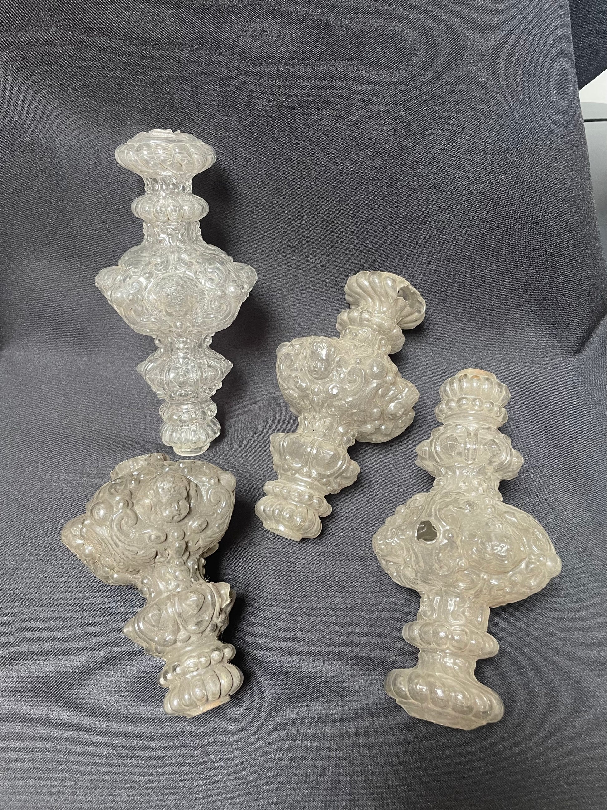 Set of four stem elements, each decorated with a putto above scrolls, with beads and diamand shaped facets. Three elements have the same length, one is smaller (decorations scheme with the same measurements).