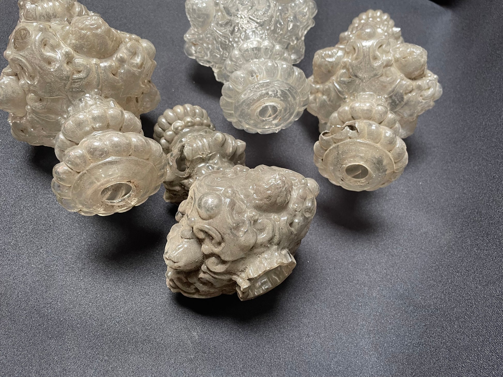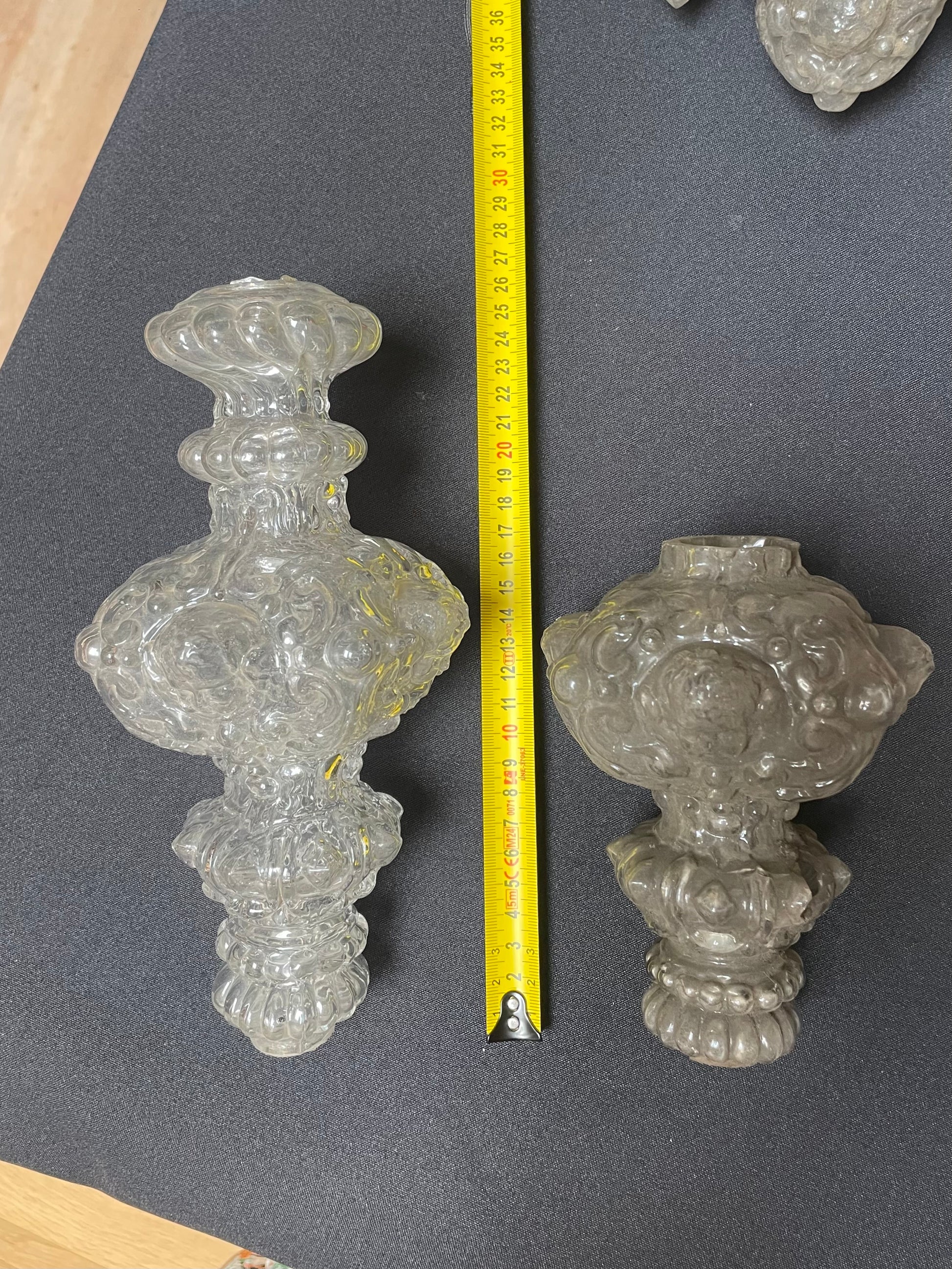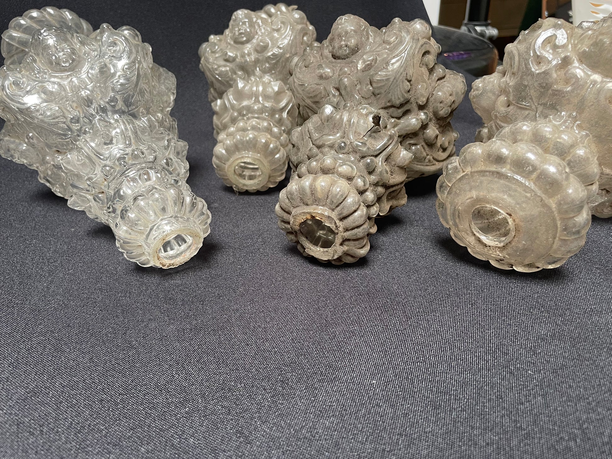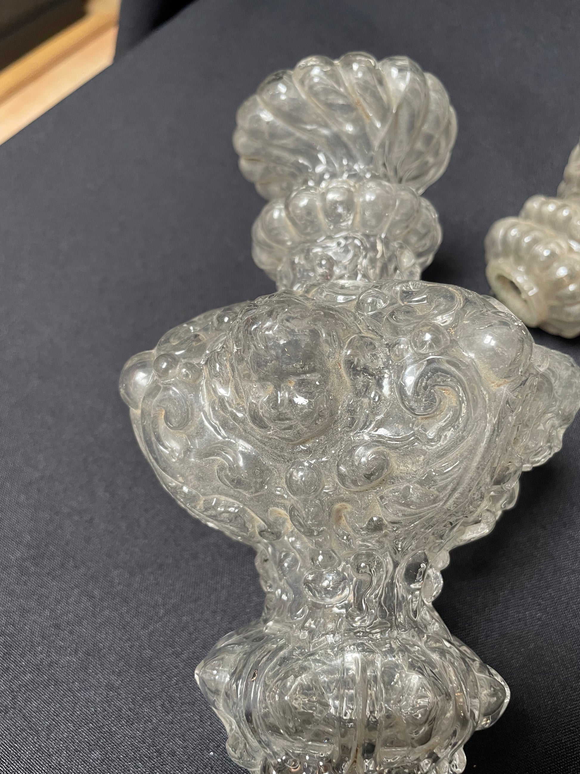 Set of four stem elements, each decorated with a putto above scrolls, with beads and diamand shaped facets. Three elements have the same length, one is smaller (decorations scheme with the same measurements).